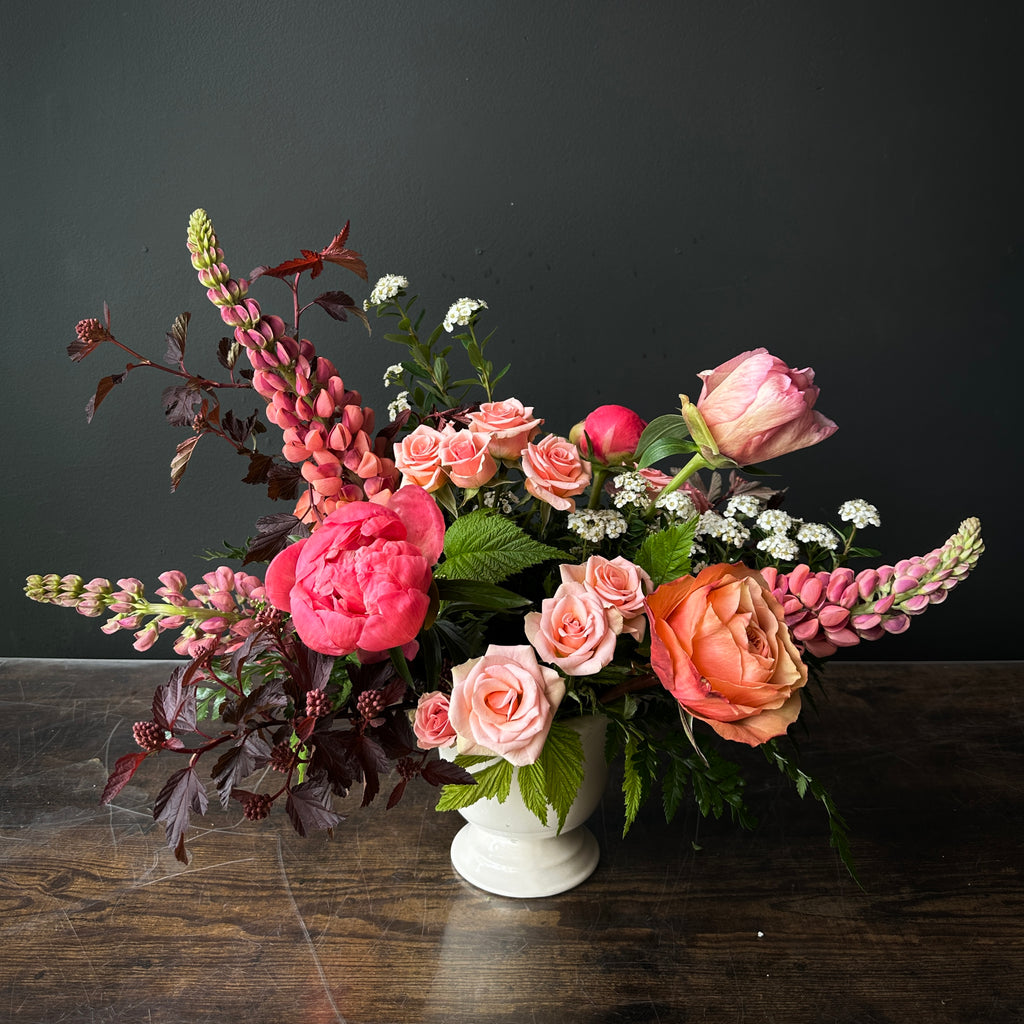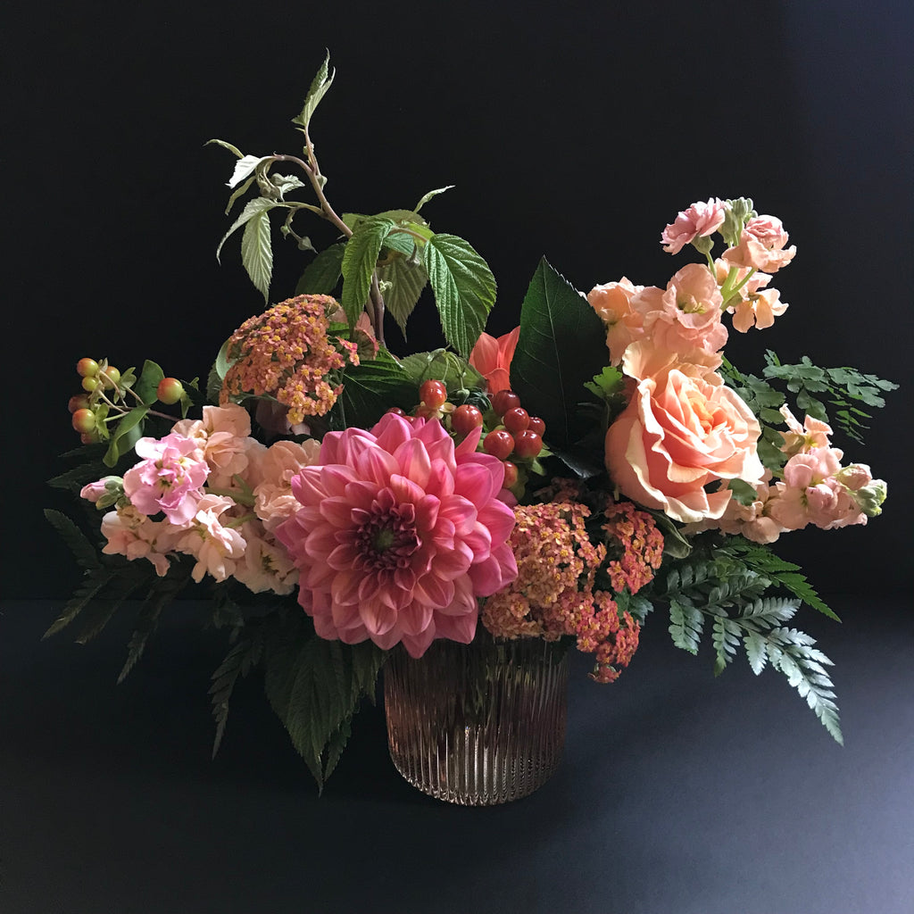 Quite possibly our most popular design, this floral combines coral and apricot blooms with seasonal accents. Floral will be designed in a vase that reflects price point.