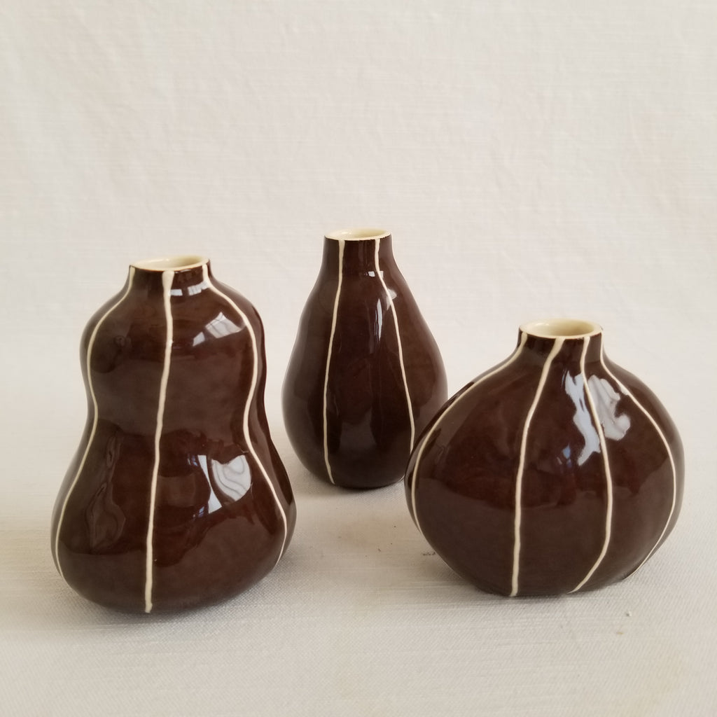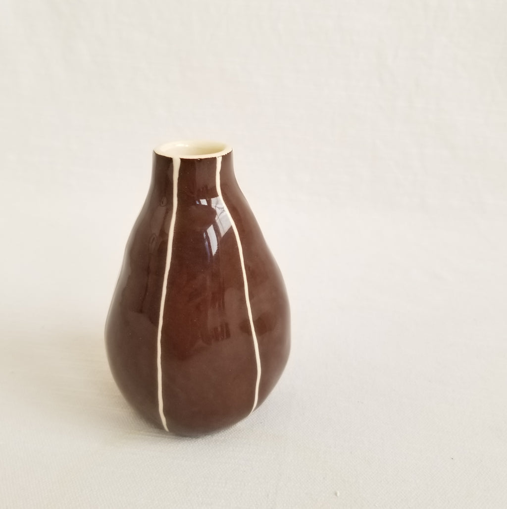 Local artist Kristin Nelson (our Greenwood neighbor) designs these unique vases. Each piece has been hand pinched and formed in clay before a mold is made to cast her products. The result is a surface that is subtly textured, in which the “artist’s hand” is visible. Thin white lines are applied by hand to ensure that each piece is unique.